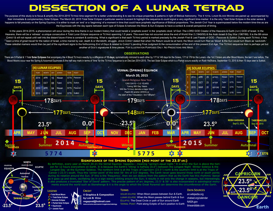 The eclipses and Jewish feasts are illustrated in the following chart, available at the website of Sonoma State University (reproduced here with their permission).4 (We are indebted to Mr. Luis Vega, the designer of the chart, who states, “the purpose of these short studies -by way of charts is to better help & instruct us to consider such patterns as they may hold a key in what happened in the Past & to what can possibly happen in the Future. Does history repeat itself? Some would say yes, others no or maybe... The research presented is in part based on speculation testing various Biblically themed theories. Facts & figures will be examined to extrapolate possible patterns; in no way are they to prove a point or have an agenda. When the theory is tested & found lacking substantially, it should be considered as such. I welcome any criticism or corrections & will adjust accordingly, time permitting." -- Emphasis added.)
