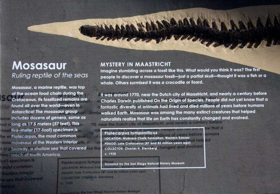 Mossasaur and Xiphactinus are presented as fossils originally found in Kansas. We immediately recognized these as graphic representations (not actual fossils, mind you) of fossils on display at the Sternberg Museum in Hayes, Kansas. The famous Sternberg fossil of a 6-foot fish inside a 15-foot fish is conspicuously absent from this museum, presumably because of the difficulties it presents for the evolutionary viewpoint of “gradual deposition” of fossils.