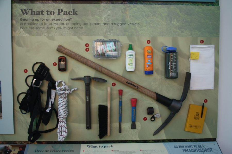 The tyrannosaurus rex fossil was supposedly found in Kansas as well, not by Sternberg, but by an earlier paleontologist, Barnum Brown (1875-1965). One of the displays shows the tools that fossil hunters have used, past and present.