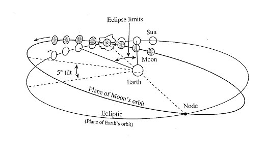 - The moon's orbit is not on the same plane around the earth, as the earth's orbit around the Sun. In fact, it is tilted 5 degrees from the ecliptic. The planes of the orbits cross on a straight line called the node.