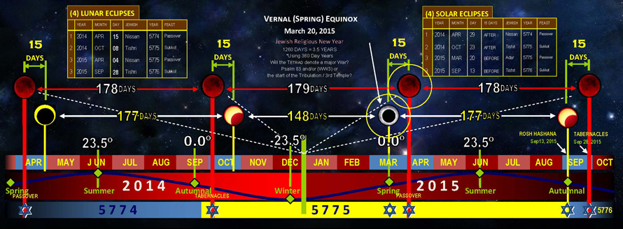 The purpose of this illustration is to layout astronomically, the 4 Blood Moons of the Tetrad of 2014-2015. This chart shows the patterns of just how the Solar and Lunar Eclipses are juxtaposed to each other. The 4 Total Lunar Eclipses are paired up with their Solar Eclipse that occur 15 days apart. …. A Tetrad is when 4 consecutive Total Red Blood Moons occur without any partial lunar eclipse in-between the series. They come in pairs and are separated by 6 months.
